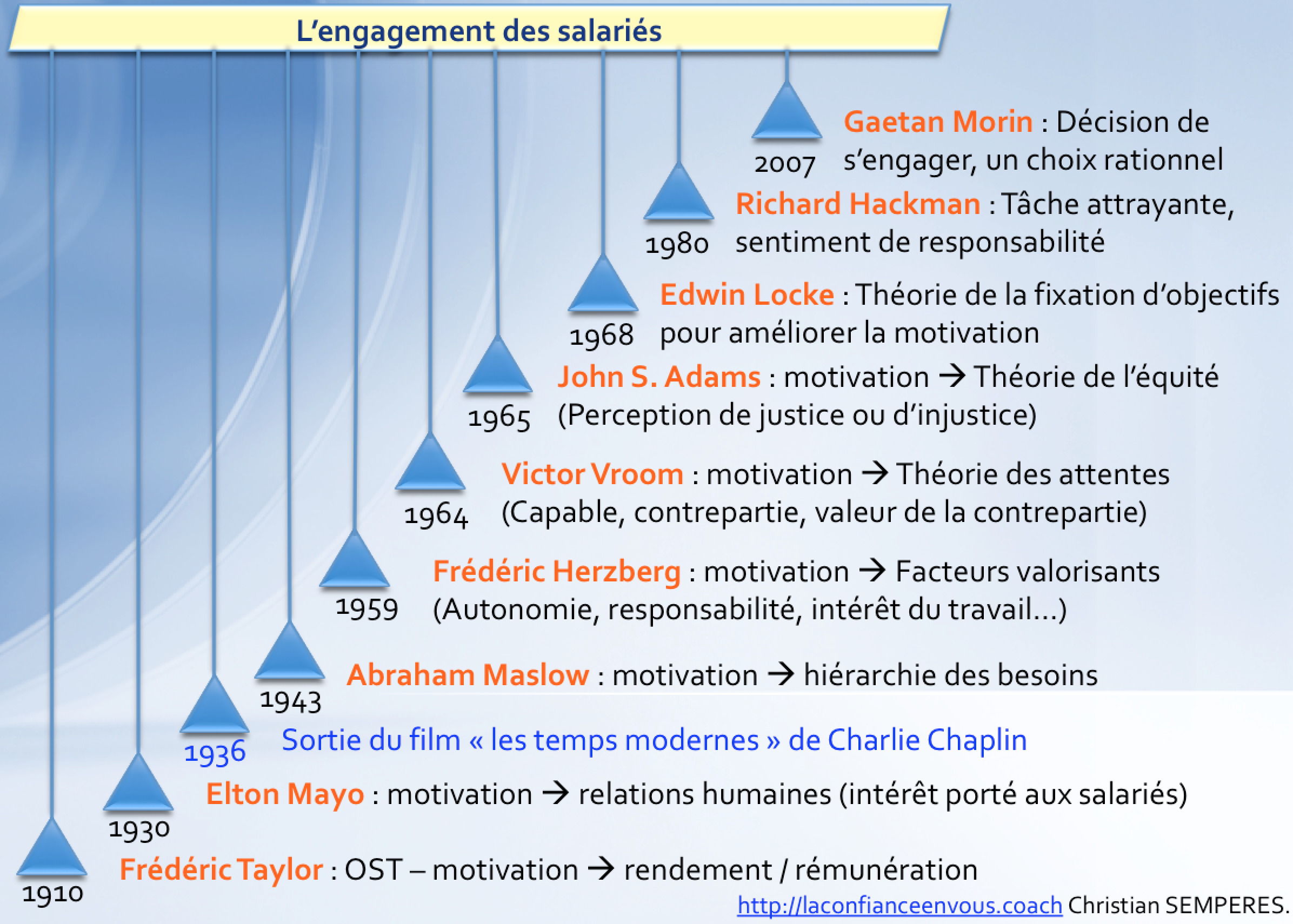 Ils sont nombreux les psychologues du travail qui ont travaillé sur ce qui conditionne l’engagement des collaborateurs. A commencer par Taylor en 1910 qui faisait un lien direct entre rendement et rémunération dans sa théorie de l’organisation scientifique du travail. Rappelez-vous le film « les temps modernes » de Charlie Chaplin qui montre le contremaître passer dans la ligne de production pour botter le postérieur de ses ouvriers. Nous sommes en 2018. Si vous en êtes resté à ce cliché du « collaborateur uniquement centré sur son salaire et ses RTT » , je vous laisse à votre réflexion. Ensuite, Mayo, Maslow, Hersberg, Vroom, Adams, Locke, Hackman, Morin pour ne citer qu’eux ont successivement ajouter d’autres types de motivation provenant des relations humaines, de l’intérêt porté aux collaborateurs, d’une hiérarchie des besoins, de la prise de conscience de l’intérêt du travail, de sa responsabilité, de son autonomie, de la perception de justice, de la fixation d’objectifs et pour finir que l’engagement est basé sur un choix rationnel du collaborateur.