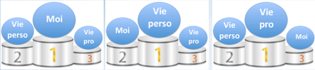 A regarder ces 3 catégories, vous voyez bien qu’on aura du mal à se mettre d’accord. Chacun aura son choix de podium. Et ce choix peut varier tout au long de sa vie. Par exemple, à l’adolescence, on peut mettre d’abord les besoins relatifs au MOI ou à la VIE PERSO, l’école … son éducation pour prévoir l’avenir … ça passera après. Puis, réussir ses études peut devenir un besoin pour satisfaire un autre besoin de vivre en fondant un foyer (par exemple) et avoir les moyens de satisfaire ce nouveau besoin. On commence à mettre un ordre chronologique à ses besoins. Mais là aussi, en couple, on peut avoir une priorisation des besoins radicalement opposée entre les 2 conjoints. Alors … bonheur personnel ou bonheur partagé ? Complexe la quête du bonheur, non ? Il se rajoute que le podium des besoins change tout au long de sa vie. Si on n’en a pas conscience, on reste bloqué sur un besoin qui « était » la priorité jadis et donc on cherche à le satisfaire, mais rien ne va. Eh oui ! Parce que finalement on ne satisfait pas celui qui est devenu aujourd’hui prioritaire, inconsciemment. (Cf une de mes clientes qui en a pris conscience en processus de coaching, une vraie révélation !) C’est pour cela que la quête du bonheur est un parcours sans fin. C’est pour cela qu’il est individuel. C’est pour cela que la quête du bonheur est un parcours initiatique qui demande un apprentissage personnel pour sans cesse se réinterroger sur ce qui est important pour soi, là, aujourd’hui ! C’est en cela que le coaching de développement personnel est efficace. Le coach vous aide à y voir clair.