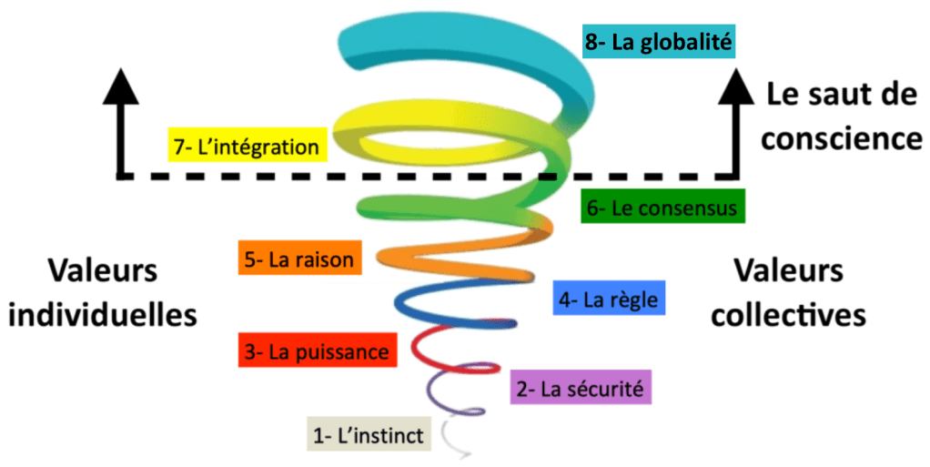 Cette alternance entre valeurs collectives et valeurs individuelles est une constance de l’évolution humaine … individuelle et … collective ! Notre évolution en tant qu’individu, mais aussi en tant qu’homo sapiens. C’est ce que nous dit Clare Graves, psychologue du XXème siècle, créateur de ce concept de la Spirale dynamique. Suivant ce concept de l’évolution de l’homo sapiens, après 300 000 ans d’existence, l’Humanité est aujourd’hui au passage entre le 5ème et le 6ème niveau d’existence de son évolution. Et à chaque niveau d’existence, son propre système de valeurs, sa propre vision du monde spécifique. Ce concept démontre que l’Humanité est passée alternativement de valeurs individuelles à des valeurs collectives et … ainsi de suite. Egalement, ce concept démontre aussi, que de sa naissance à l’âge adulte, chaque être humain passe aussi par exactement les mêmes niveaux d’existence et dans le même ordre par lesquels l’Humanité est passée, en alternant donc aussi à des valeurs individuelles puis collectives et … ainsi de suite.