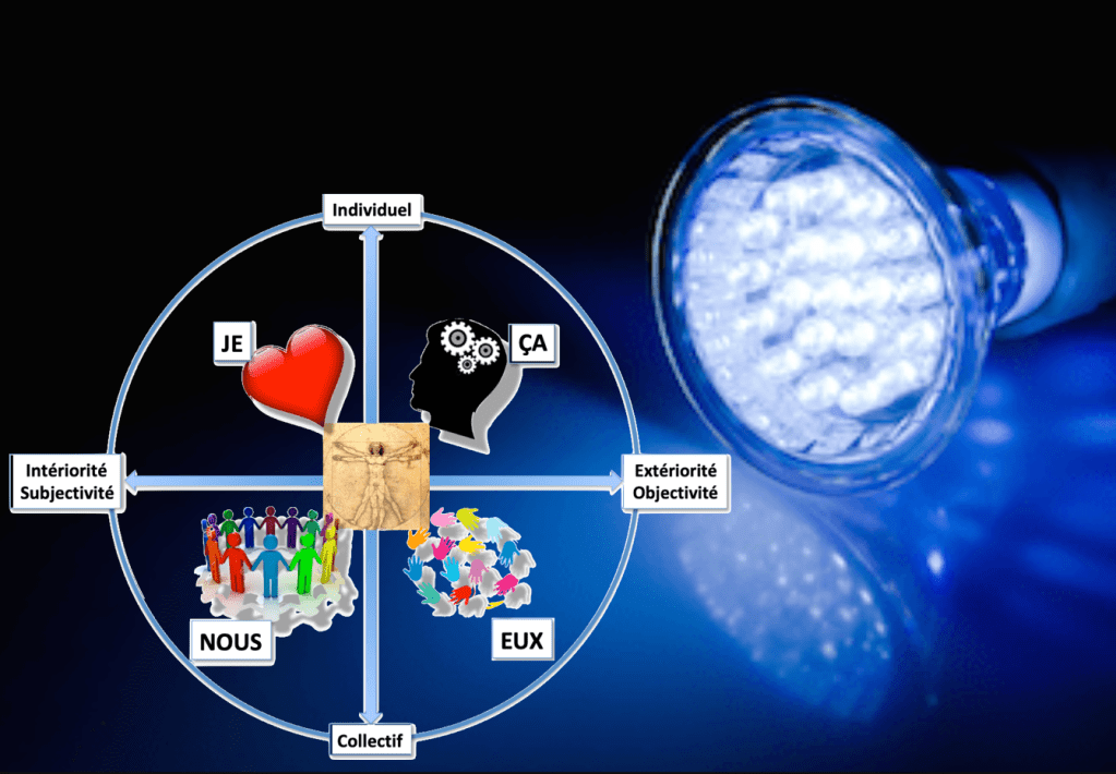 Avant même d’aborder le comment accéder à la pensée de l’autre, définissons le verbe interpréter. C’est « rendre clair ce qui est obscur. » Dans cette définition, on admet donc que la pensée d’autrui est obscure, non observable directement donc. Il convient donc d’y mettre un coup de projecteur. Mais de quel coté mettre la lumière ? Suivant le coté par lequel j’éclaire un objet, je vais influencer l’interprétation de l’objet. Pour accéder à la pensée de l’autre, il me faudra user de plusieurs coups de projecteurs dans mon questionnement de manière à explorer toutes ses facettes. Ken Wilber propose d’interpréter suivant les 4 quadrants de son concept de vision intégrale comme présenté sur l’image.