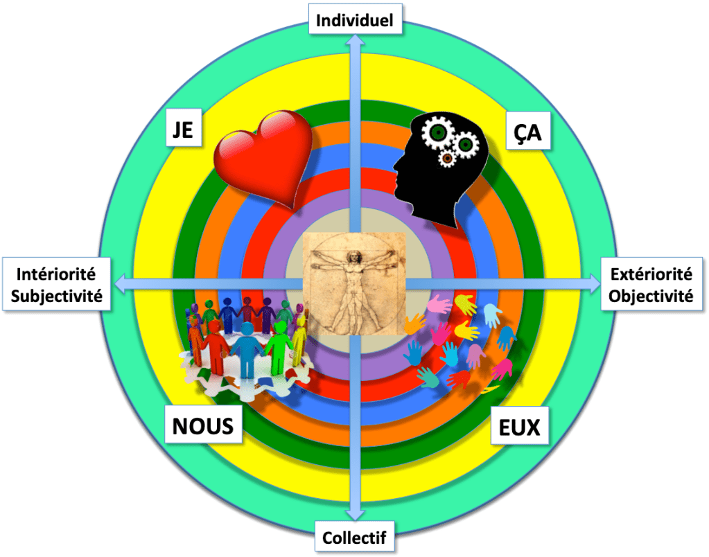 - l’intentionnel c’est à dire ce qui est individuellement subjectif, le quadrant en haut à gauche, le « JE »,