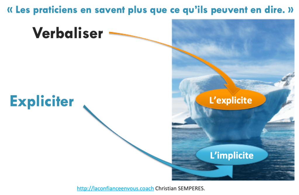 Oui ChatGPT, c’est en examinant de manière critique ce que le praticien a fait qu’il identifiera ses axes d’amélioration. Encore faut-il que ce qu’il examine soit pertinent ! Comme Donald Schön nous dit que la verbalisation ne permet d’exprimer qu’une infime partie de ce que le praticien sait faire, tu ne nous dis toujours pas comment faire ! Autrement dit « Verbaliser l’explicite » ne suffit pas à prendre conscience de sa pratique. Comme un iceberg, la plus grande partie est cachée sous l’eau. « L’expérience est cachée dans l’agir » nous dit Yann Vacher, il faut aller la chercher. Il convient donc « d’expliciter l’implicite de sa mémoire procédurale !« C’est pour ça que la Pratique réflexive n’est pas innée mais qu’elle s’acquiert par entraînement. Il faut s’entraîner à expliciter l’implicite ! Pour en prendre « conscience. » Il faut l’avoir vécu ! Il faut être Sapiens donc, pas un robot. L’explicitation de sa pratique n’est pas innée non plus, il y a des techniques pour cela, ça s’apprend. J’en parlerai durant ma webconférence en présentant la technique d’entretien d’aide à l’explicitation de Pierre Vermersch, psychothérapeute chercheur au CNRS, une technique sur laquelle j’ai été formé et recyclé périodiquement durant toute ma carrière.