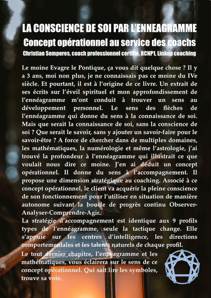Après avoir approfondi l’ennéagramme, j’ai élaboré une stratégie d’accompagnement de type coaching professionnel à partir de cet outil de connaissance, d’acceptation et de conscience de soi. Depuis 5 ans, j’utilise et peaufine cette stratégie d’accompagnement auprès de mes clients lorsque l’utilisation de l’ennéagramme est utile à l’atteinte de leur objectif de coaching. Quel que soit le profil de personnalité, cette stratégie donne de bons résultats pour l’autonomie du client qui s’oriente consciemment vers l’utilisation de ses talents naturels, plutôt que ses travers tout aussi naturels. J’ai structuré cette stratégie dans un livre très documenté et illustré dont le titre est « La conscience de soi par l’ennéagramme. » Vous aurez noté qu’il s’agit bien de conscience de soi et non uniquement de connaissance de soi. Vous l’aurez compris, mon objectif est de dépasser le simple constat d’être « comme-ci et comme ça. » L’intention est d’opérer une déprogrammation de ses travers comportementaux naturels dans lequel le profil de personnalité nous enferme souvent, pour ne conserver que le meilleur, ses talents naturels pour s’ouvrir au monde. Connais-toi toi-même et… Etc. Etc.
