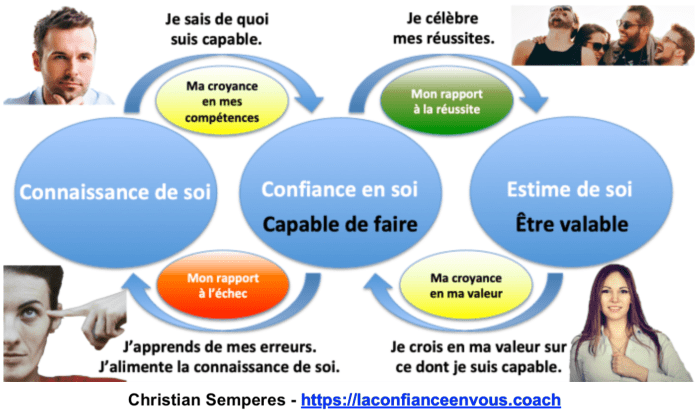 « Je vais maintenant valoriser mes tentatives infructueuses pour m’améliorer. » Avant d’atteindre son objectif, le client en processus de coaching tente des actions. Certaines sont concluantes et permettent de gravir une marche dans la perspective de son objectif final. D’autres renvoient à la case départ. Elles sont souvent vécues comme « un échec » par le client. Le coach est là pour aider à la mise en lumière de ce qui constitue la base de l’apprentissage, à savoir, « les tentatives infructueuses » qui permettent de mettre en lumière les compétences à améliorer. Avant d’apprendre à tenir sur un vélo sans roulettes, vous en avez pris des gamelles, vous en souvenez-vous ? Bien sûr que non ! L’analyse de ses « échecs » et la compréhension de leurs causes sont des sources d’amélioration dans la perspective de son objectif final. Comme le montre ce schéma ci-dessous, le rapport positif qu’on entretient avec ses échecs est une reprogrammation reproductible dans tous les challenges de la vie. On alimente ainsi la connaissance de soi qui alimente la confiance en soi, c’est-à-dire l’amélioration et la connaissance de ce que je suis capable de faire.