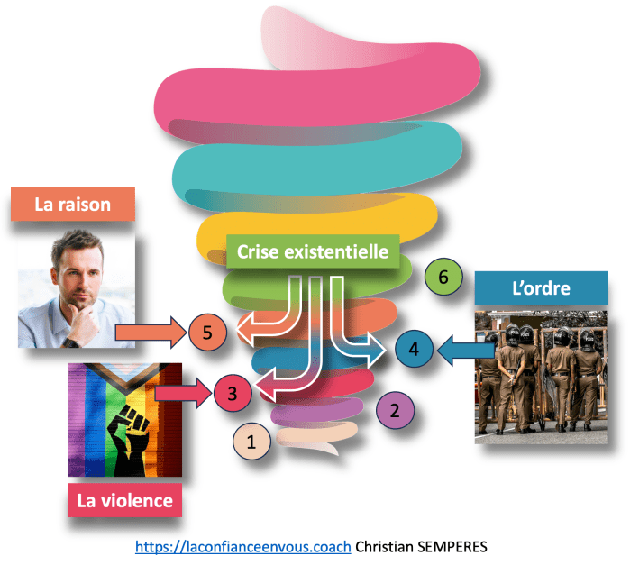 Comment le niveau de conscience VERT, un système de valeurs tourné vers la nature, peut-il entraîner une crise existentielle et un blocage de l’Humanité ? C’est simple à comprendre. Comme chaque idéologie créée par Sapiens, l’écologisme doit imposer son dogme pour atteindre son paradis. Les mouvements écologistes radicaux (niveau VERT) en appellent à la rationalité (niveau ORANGE), mais imposent leurs dogmes (niveau BLEU) par des actions radicales (niveau ROUGE), créant ainsi une nouvelle crise existentielle.